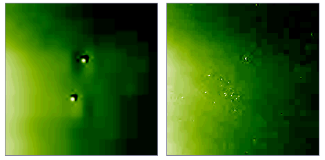 La misma imagen comprimida con el algoritmo de fuerte compresión usado en el Beacon stream y la imagen de la derecha, con un algoritmo estandar de compresión en el que se aprecian los impactos de los rayos cósmicos
