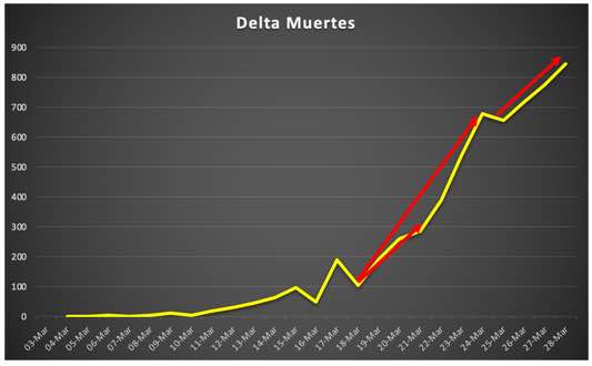 Desde los medios se nos dice que los últimos datos son esperanzadores y que la curva esta empezando a moderarse. Yo sinceramente no lo veo, y tratando de buscar algo positivo que contaros, lo único es que el crecimiento de los últimos 3 días parece que lo hace a un ritmo menor.